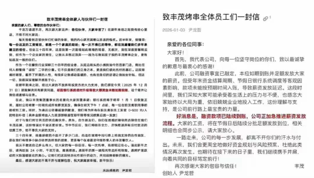 面对欠薪风波,丰茂烤串创始人尹龙哲自2025年12月底至2026年2月初连续发布三封全员信,解释资金紧张原因并承诺解决薪资问题。信件中提到,公司资金紧张源于2025年集中偿还银行贷款,导致流动资金承压,融资款项因银行系统原因未能如期到账,创始人坦言“几乎每天都在跑融资”,并希望员工停止在抖音发布欠薪内容、撤销部分投诉,以免影响融资进展。